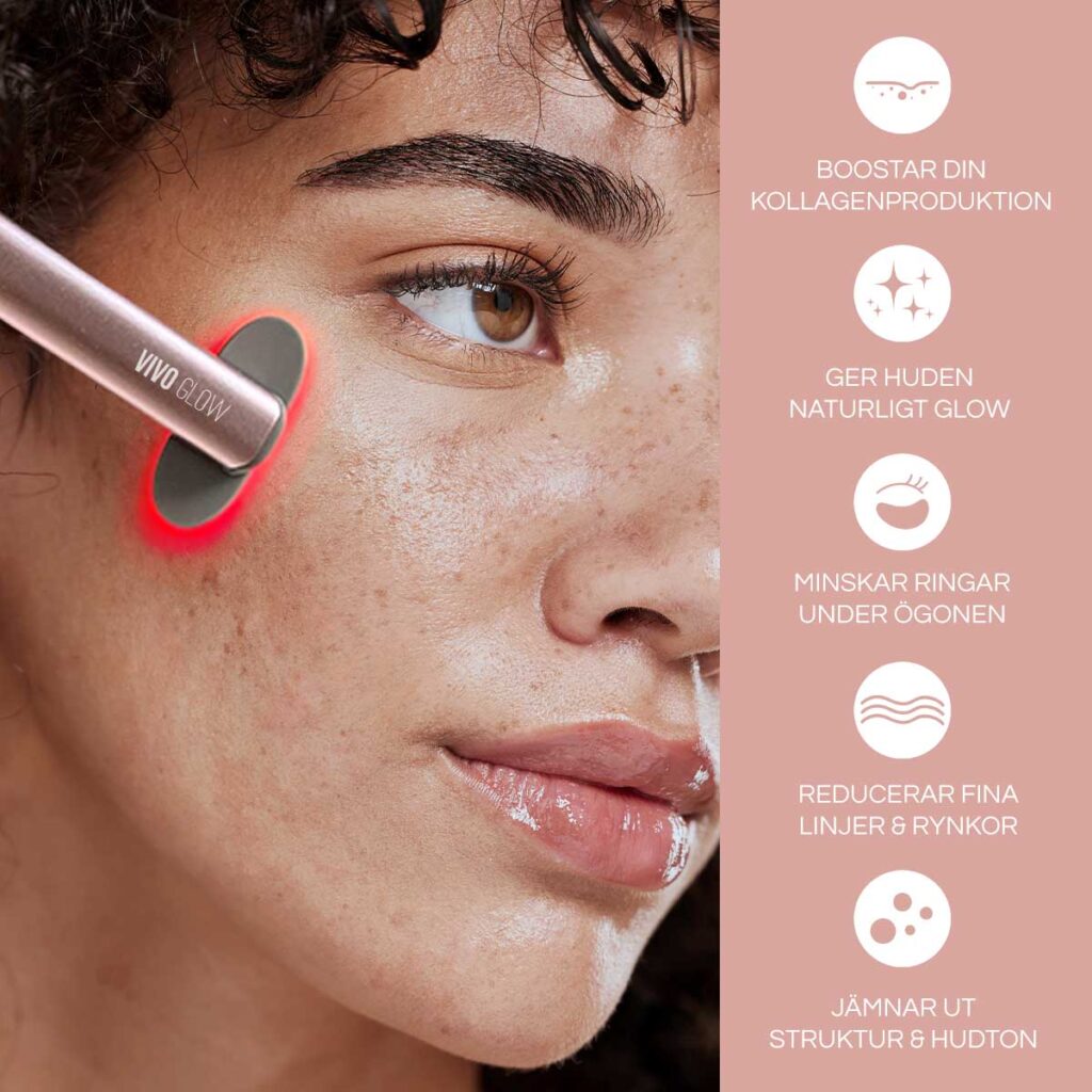 Upplev banbrytande hudvård med Vivo Glows ansiktsstav. Denna allt-i-ett-lösning kombinerar röd ljusterapi, värme, vibration och EMS mikroström för att revitalisera din hud på djupet. Perfekt för alla hudtyper. Vår ansiktsstav främjar bland annat kollagenproduktion, minskar rynkor och ger en jämnare hudton. Upptäck synliga resultat och en förbättrad hudhälsa. Ge din hudvårdsrutin en uppgradering med Vivo Glow.